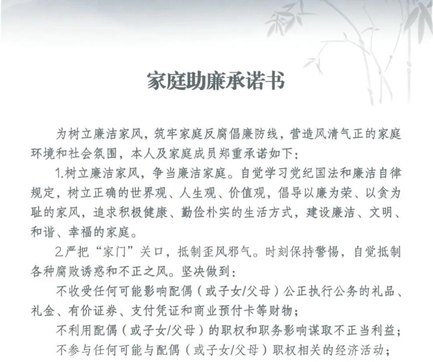 紫竹院街道向街道机关、社区党员干部及家属发放的《家庭助廉承诺书》。