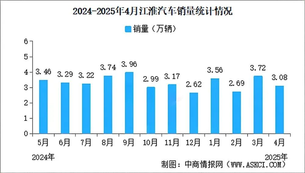 2025年1-4月,江淮汽车累计产量12.76万辆,同比减少9.38%。累计销量13.05万辆,同比减少5.90%。