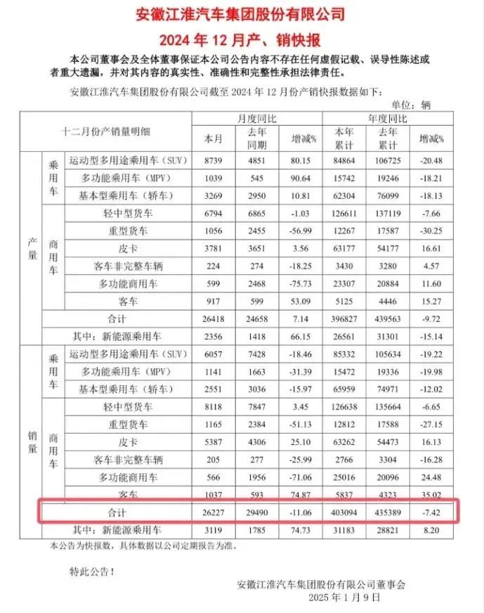 2024年,江淮汽车全年销售整车及底盘40.31万辆,同比下滑7.42%。