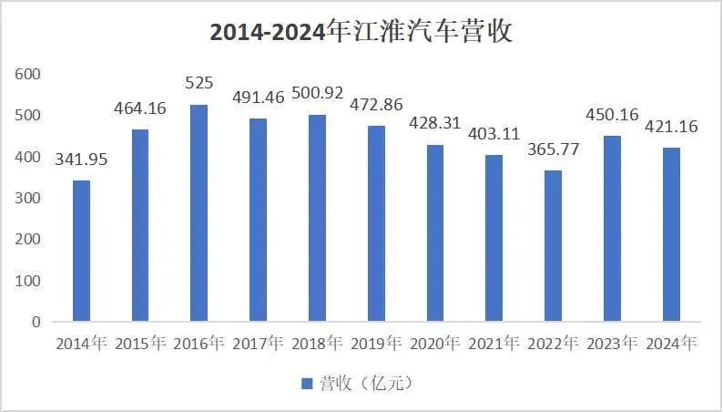 抛开趋势不谈,仅对比年度数据,江淮汽车2024年的营收比2016年少了整整100亿元。