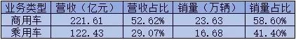 具体到销量上,全年共销售整车及底盘40.31万辆,商用车销售23.63万辆,占比58.6%。乘用车销售16.68万辆,占比41.4%。