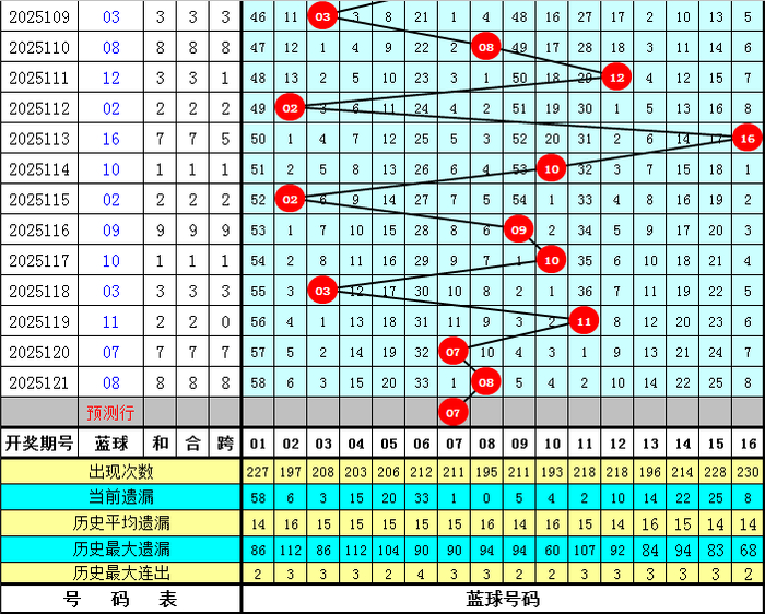 和值跨度分析:上期和值开出108,对比第2025120期和值上升了49个点位,本期预计和值在大号区域热出,看好出现在142附近。