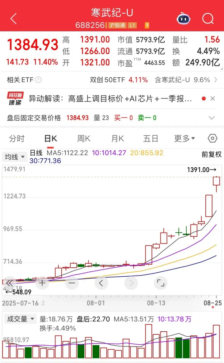 A股人气标杆寒武纪仍在持续上涨。今日盘中,寒武纪最高涨至1391元/股,收盘涨幅超过11%,总市值冲到5793.9亿元。